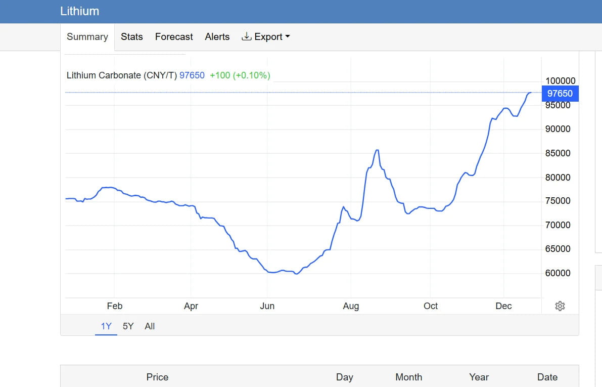 Giá lithium, nguyên liệu sản xuất pin xe điện, ngày 19/12 chạm mức 97.650 nhân dân tệ/tấn (13.868 USD/tấn) tại Trung Quốc, tăng 30,1% so với cùng kỳ năm ngoái.